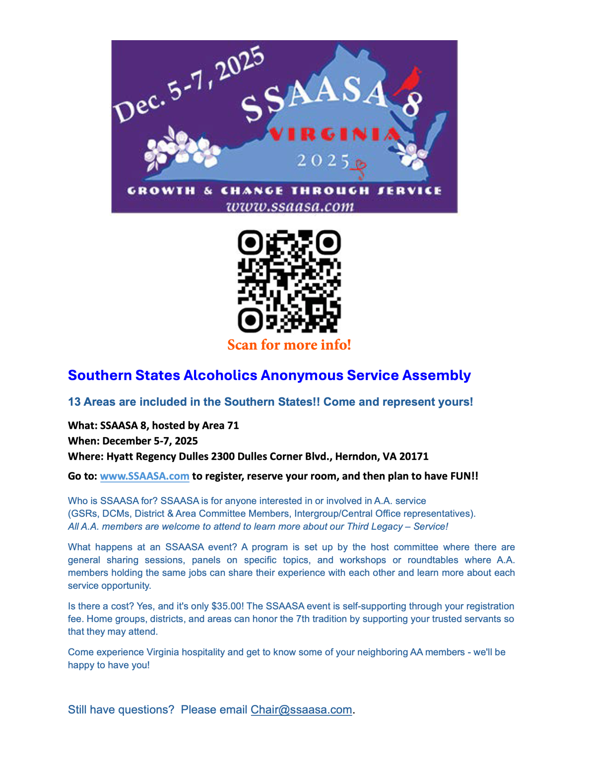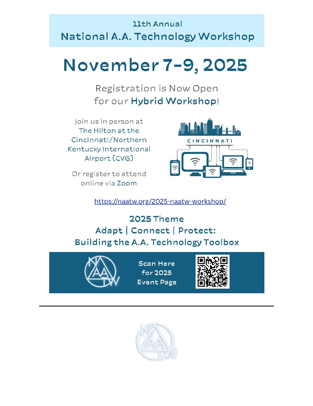 Your assistance can make a difference! The Archives Committee is responsible for things like collecting items, cataloging holdings, organizing, digitalizing, interviewing Old Timers, scanning documents, and collecting group histories. For more information, attend our meeting or send an email to archives@ashevilleaa.org. The Archives Committee meets the first Saturday of every month at 2:00pm. Join Zoom… Read More »District 70 – Archives Committee Meeting (Zoom)